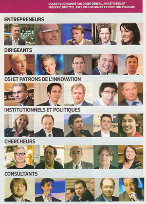 Le magazine vient de publier (n° 2152 du 29 novembre 2012*) ce qui, selon lui, représente le « Top 100 » des personnalités qui font « avancer le numérique en France ». Sans aller jusqu’à suggérer, comme le fait le Directeur de la Rédaction Frédéric Simottel dans son éditorial, que le Gouvernement devrait choisir parmi ces personnalités quelques-uns de ses ministres pour relancer l’économie française… quoique 😉 ! Le journaliste rappelle en effet que « ces personnalités sont habituées à travailler dans une économie où les lignes de front bougent en permanence, qu’elles ont toutes en tête une solution, une idée, une initiative pour relancer notre économie, booster l’emploi et ancrer la France dans le terreau de l’innovation ».